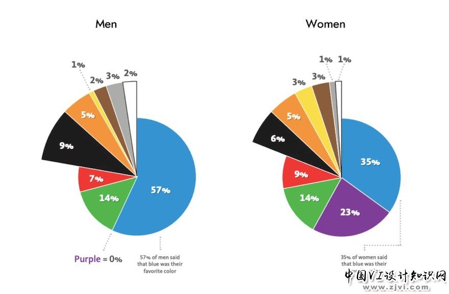根据 JoeHallock的研究,不同性别的色彩选择有天壤之别。研究旨在发现不同色彩的偏好程度,从最喜欢的色彩到不那么喜欢的色彩分别所占的比例。