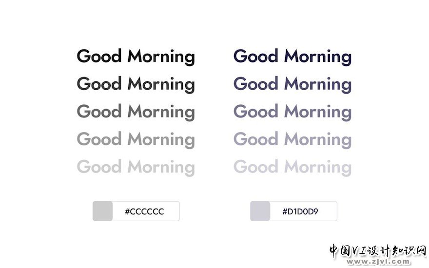 相同透明度下,两组文本字体颜色不同,效果不同。一组是灰色的,另一组是蓝灰色的,不同色调的文本对界面有显著的影响。如下图: