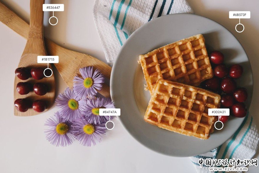 樱桃的阴影是深红色,看起来几乎是黑色,但并不是纯黑色。比如还有花儿、盘子和华夫饼的阴影,都不是纯黑色的。光和环境决定了阴影的颜色。