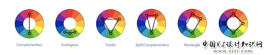 互补色、邻近色、三色组、分裂互补色、矩形(双分裂互补色)、正方形