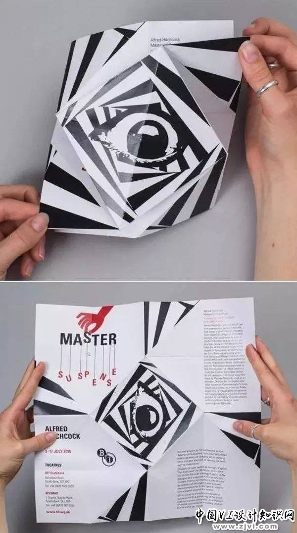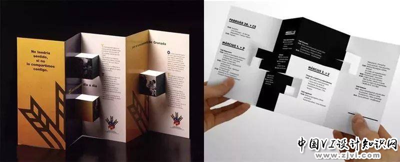 而如果把折页的封面设计成异形,那么就容易在视觉上给人眼前一亮的感觉,从而提升阅读率。当然,也不能为了异形而异形,通常这么做是为了利用异形与内页形成互动,制造一些比较有意思的效果。