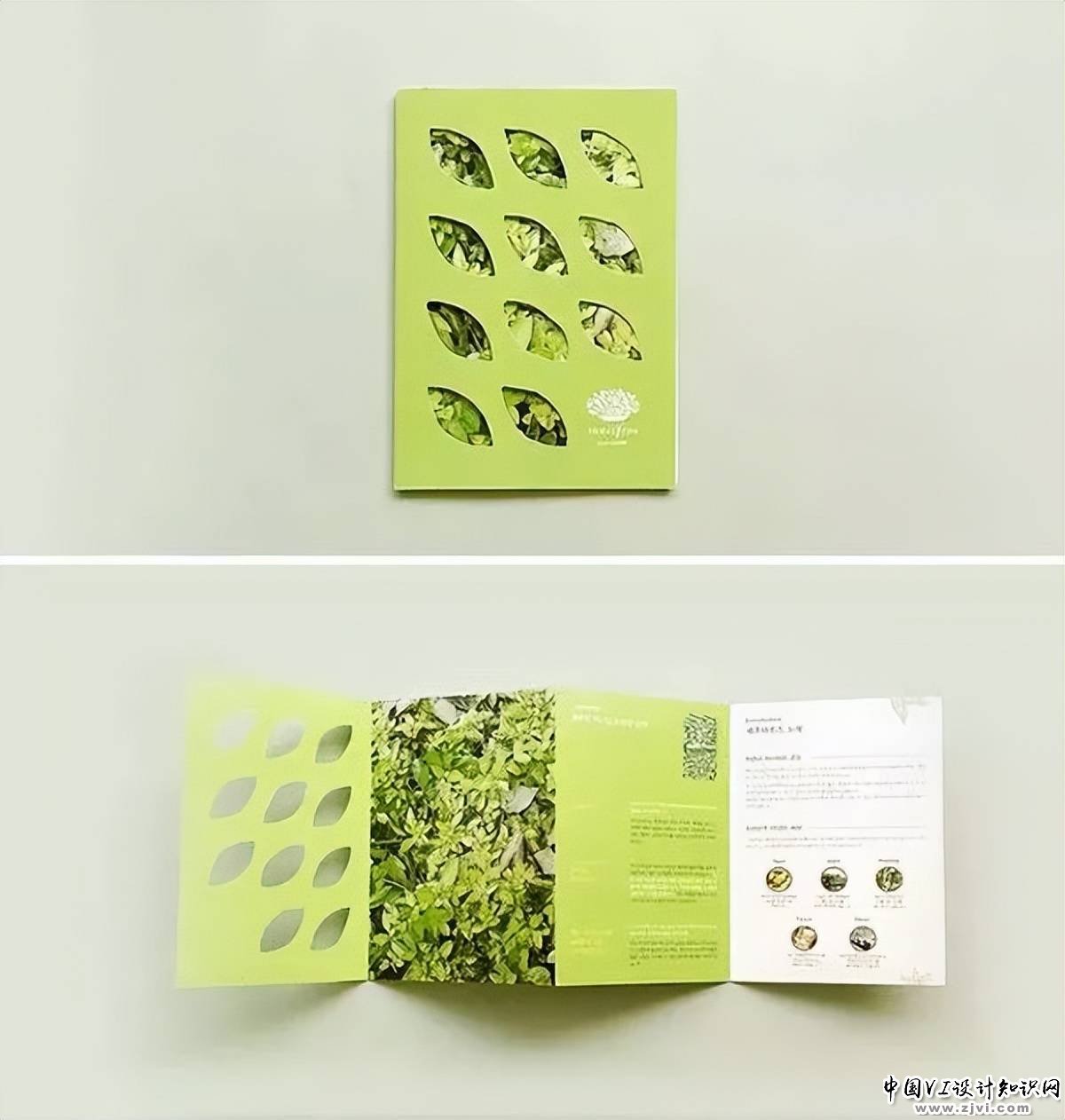 封面镂空在画册设计中经常被用到,但在折页中比较少见,这种工艺对纸张也有一定的要求,适合比较厚的纸。封面镂空的亮点在于,可以通过镂空的图形展现出内页的内容,并使露出的内容与封面元素相互作用,从而制造视觉上的舒适体验。